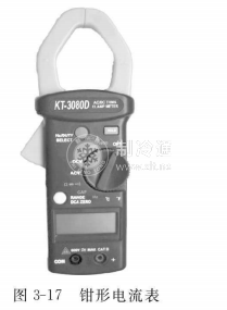 鉗形電流表(圖3-17)簡稱鉗形表。鉗形表是數字萬用表的一個重要分支,是一種用于測量正在運行的電氣線路電流大小的儀表,可在不斷電的情況下測量電流。它是專門測量交流大電流的電工儀器。