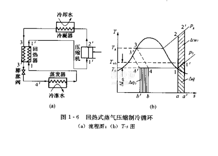 圖1-6所示為來自蒸發器的低溫氣態制冷劑1,在進人壓縮前先經過一個熱交換器—回熱器。在回熱器中低溫蒸氣與來自冷凝器的飽和液態制冷劑3(或再冷液)進行熱交換,低溫燕氣1被定壓過熱至狀態1',而溫度較高的液體3被定壓再冷卻到狀態3',回熱循環1'→2'→3→3→4’→1→1'中,3→3為液體的再冷卻過程,1→1'為低壓蒸氣的過熱過程,過熱后的蒸氣濕度T,稱為過熱溫度,過熱溫度與蒸發溫度之差△:,b稱為過熱度。