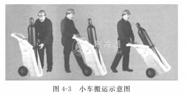 近距離(5m內)移動氣瓶,應手扶瓶肩轉動瓶底,并且要使用手套。距離較遠時,專用小車搬運,如圖4-3所示。