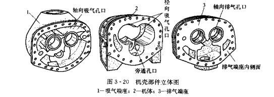 壓縮機的工作氣缸容積由轉子齒槽與氣缸體、吸排氣端座構成。吸氣端座和氣缸體的壁上也開有吸氣孔口(分軸向吸氣門和徑向吸氣口),排氣端和氣缸體內壁上也開有排氣口,而不像活塞式壓縮機那樣設吸、排氣閥。吸、排氣口大小和位置是經過精心設計計算確定的。隨著轉子的旋轉,吸、排氣口可按需要準確地使轉子的齒槽和吸、排氣腔連通或隔斷,周期性地完成進氣、壓縮、排氣過程。轉子、機體殼體部件如圖3-19、圖3-20所示。