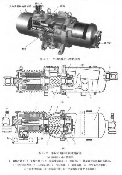 2.半封閉螺桿式制冷壓縮機半封閉螺桿壓縮機利用排氣壓力和吸氣壓力之間的壓差進行供油的方式,使潤滑油系統大大簡化;在高冷凝溫度或低蒸發溫度的情況下,除常規噴油冷卻外,還在壓縮機轉子間直接噴射制冷劑液體進行補充冷卻,使機組工作更加可靠,應用工況范圍擴大;壓縮機無油泵,也沒有油冷卻器,內置油分離器和油過濾器。目前半封閉螺桿壓縮機在空調工程領域已基本取代過去的開啟式噴袖式螺桿壓縮機。圖3-21為某品牌半封閉螺桿式壓縮機模型,圖3-22為螺桿式壓縮機結構圖,其排氣口位置與圖3-21有所不同。3.全封閉螺桿式制冷壓縮機甘前的全封閉螺桿式制冷樂縮機多為立式雙螺桿轉子,體積緊湊,占有空間小。其結構見圖3-23。