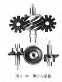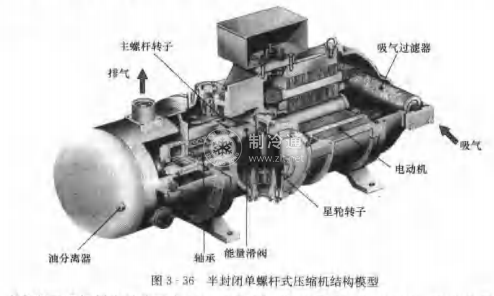 圖3-36為半封閉單螺桿式壓縮機結(jié)構(gòu)模型,其外形與雙螺桿半封閉壓縮機有些類似,均在壓縮機殼內(nèi)置了油分離器和吸氣過濾器。單螺桿壓縮機制冷量范圍為106一624kW,常用來配置冷水機組、風(fēng)冷熱泵冷熱水機組等。