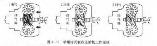 單螺桿式壓縮機螺桿高速運轉(zhuǎn)時氣流脈動小、排氣量大。因星輪對稱安裝,螺桿受力完全平衡,所以運轉(zhuǎn)平衡、振動小,噪聲比雙螺桿式低10B以上:同時,因螺桿受力完全平衡,能在很小的工作間隙下工作,因而泄漏小、薦積效率高:單螺桿不像雙螺桿那樣在有彎曲變形的情況下運行,因此可以在高壓下工作,即使在一級壓縮時也可達(dá)6,16MP,而雙螺桿壓縮機最高只能達(dá)到2.8MP:單螺桿比雙螺桿節(jié)能,井且軸承尺寸不像雙螺桿式那樣受限制而壽命更長。突出的優(yōu)點就是結(jié)構(gòu)簡單,零部件少,質(zhì)量輕,機器效率高、功耗低且振動小、噪聲低,形成了自己獨特的競爭優(yōu)勢。目前單螺桿式壓縮機分開啟式和半封閉式兩種單螺桿工作過程與容積式壓縮機類似,有吸氣、壓縮,排氣三個過程,如圖3·5所示,