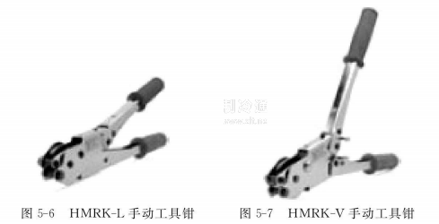 HMRK-L手動(dòng)工具鉗(圖5-6)為經(jīng)典款式,用于連接直徑13mm以下的管路。由于專利省力設(shè)計(jì),該工具不需要專門的動(dòng)力裝置,只需要一點(diǎn)力量就能完成裝配。工具鉗口易于更換。