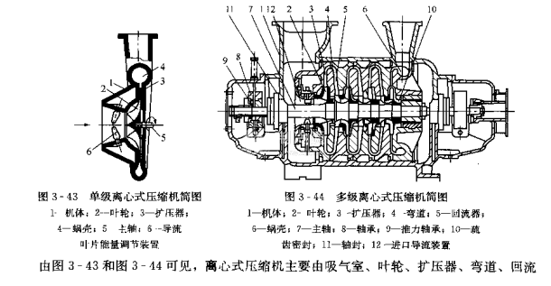 由上述工作過程可看出,離心式壓縮機是利用旋轉的葉輪對氣體作功,使氣體獲得動能,爾后將動能轉變為壓力能來搓高體的壓力。壓縮腔的容積并沒有發生變化,這與活塞式等容積式壓縮機有明顯差別。