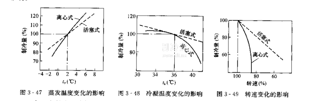 (1)蒸發溫度的影響。當制冷壓縮機的轉速和冷凝溫度一定時,縮機制冷量隨蒸發濕度變化的百分比如圖3·47所示。從圖中可見,離心式制冷壓縮機的制冷敏受蒸發溫度變化的影響比活塞式壓縮機明顯。蒸發溫度越低,制冷量下降得越劇烈。