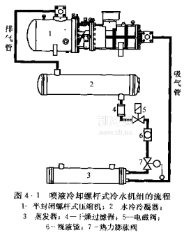 圖4-1為水冷式半封閉螺桿式冷水機(jī)組的簡單流程。其制柃過程為:制冷劑在蒸發(fā)器中氣化,所產(chǎn)生的旅氣流到壓縮機(jī)的吸氣端,進(jìn)入電動機(jī)室,拎卻電動機(jī)(開啟式除外),然后進(jìn)壓縮機(jī)。制冷劑在壓縮機(jī)中被壓縮為高溫高壓氣休,經(jīng)壓縮機(jī)內(nèi)置的油分離器后,逃入冷凝器;在冷凝器中變?yōu)轱柡鸵后w后經(jīng)下燥過濾器、電磁閥、視液鏡后進(jìn)入熱力膨脹閥。經(jīng)膨脹閥降壓后,成為低壓液體(混有少量氣體)進(jìn)入蒸發(fā)器氣化吸熱。電磁閥用于在停機(jī)行切斷制冷管路,防止冷凝器中液態(tài)制冷劑流入蒸發(fā)器,在下次啟動時導(dǎo)致壓縮機(jī)吸入液態(tài)制冷劑引起液擊事故。視液鏡主要用于觀察液態(tài)