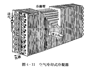 如圖4·11所示為強制對流式風冷冷凝器,制冷劑熱氣從進氣口進人各列傳熱管中,空氣以2一3m/s的迎面流速橫向掠過管束,帶走制冷劑的冷凝熱,凝液由下部排出冷凝器。
