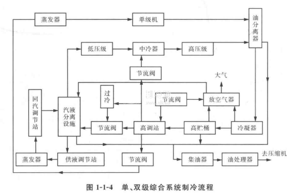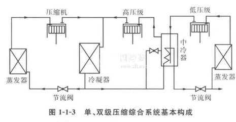 冷庫中,蒸汽壓縮制冷裝置并不總是純粹的單級或純粹的雙級系統,更多的情況是兩者并存的綜合系統,如圖1-1-3所示,由圖可見:綜合系統實際上是單級系統和雙級系統共同并聯到一個冷凝器上的綜合體。