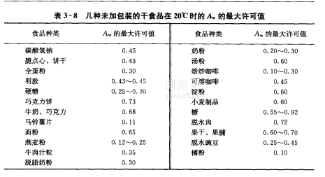 (2)表3-8中Aw的最大許可值是在一定的條件下獲得的,包括溫度、 H等;而且所指的最大許可值,大多僅是針對某一指標,如某種微生物。