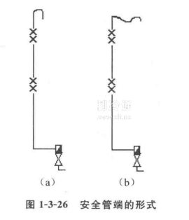 安全管的末端應有防雨設施,常見的做法如圖1-3-26(a)所示,其做法簡單,但水蒸汽容易進入管內使之生銹腐爛。圖(b)所示的是美國近年來改進后的設置形式,因在管末端設有存油彎,可防止濕空氣進入管內。