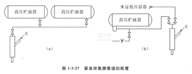 在氨制冷裝置中,緊急泄氨器應(yīng)與貯氨較大的容器,如貯液器、低壓循環(huán)桶、蒸發(fā)器等設(shè)備的底部接通,如圖1-3-27所示。