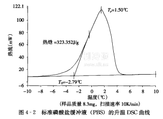 圖4-2是標準磷酸鹽緩沖液(PBS)的升溫DSC曲線,向上的峰是冰品的熔融峰。利用軟件提供的功能可實現(xiàn)相變焓的讀取。圖4~2中T。對應(yīng)的點是峰的上升沿斜率最大的點處的切線與基線的交點的溫度。