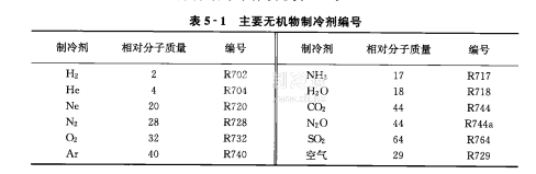 (1)無機物:無機物的編號首位為7,7后面的數字是該無機物的相對分子質量的整數部分。對于相對分子質量的整數部分相同的物質,在后面加英文字母來區別。主要無機物制冷劑的編號見表5-1,