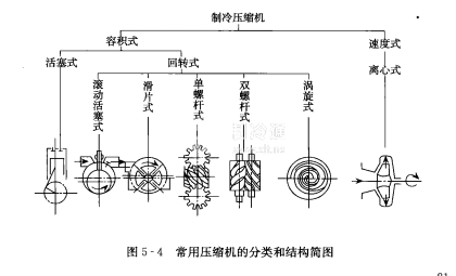 壓縮機按工作原理可分為容積式壓縮機和速度式壓縮機。容積式壓縮機直接對一可變容積中的氣體進行壓縮,使該部分氣體容積縮小、壓力提高,其特點是壓縮機具有容積可周期變化的工作腔。容積型壓縮機根據其工作部件的運動形式,又可分為往復式和回轉式。前者是活塞在汽缸內做往復運動,活塞式壓縮機屬于這種類型,在冷庫制冷系統中最為常用;而后者是工作部件在汽缸內做回轉運動,滾動轉子、螺桿式和渦旋式壓縮機都屬于這種類型。速度式壓縮機首先可使氣體流動速度提高,即增加氣體分子的動能,然后使氣流速度有序降低,使動能轉化為壓力能,與此同時氣體容積也相應減小。其特點是壓縮機具有驅使氣體獲得流動速度的葉輪,離心式壓縮機屬于這種類型、圖5-4為目前常用壓縮機的分類和結構簡圖。