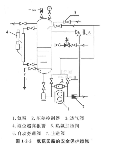 液泵的安全保護(hù)措施包括:低壓循環(huán)桶正常液位控制及設(shè)置加壓管,液泵上裝設(shè)抽氣管和壓差控制器,泵出口設(shè)置自動旁通閥和止回閥,見圖1-2-2。