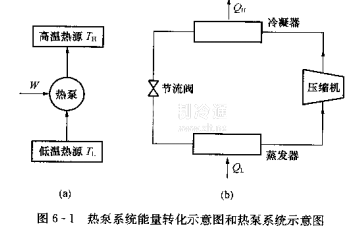 在外界能量W的作用下,熱泵從低溫熱源吸收低位熱能Q,并向高位熱源輸送高位熱能QH,由此可見,熱泵的工作原理與制冷機相同,但它們的工作目的不同,工作溫度范圍也不同。制冷裝置的熱源溫度為環境溫度,是將冷源的熱量轉移到環境中去,使冷源保持低溫,而熱泵冷源溫度是環境溫度,是將環境中的熱量轉移到熱源中去,使熱源保持一定的高溫。