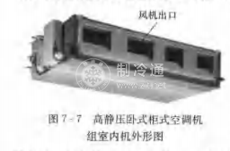 的渠中式中央空調,但其規模要小得多,故歸人戶式中央室調(也叫小型中央空調)中。一般風冷熱泵型吊頂式風管機在我國長江流域南北等地區的民用建筑中應用較多,如面積在數百平米的門廳,飯店和別墅等:對于出口靜壓較低的吊頂式風管機,一般回風先經過風機加壓,再經蒸發器至出風口,其結構與直接送風的圖?-4臥式暗裝型室內機是相同的。對于出口靜壓較高的吊頂式風管機,一般回風先經過蒸發器,再由風機吸入送至出風口,這時連接的風管需接變徑管,圖7~7為高靜壓臥式風管機外形圖,為降低機組高度,該型機組采用了4臺小風機,故有4個送風口,由于送風口風量調節上的難度,風管機系統一般不對各空調房間進行單獨控制,也就是說,當風管機運行的時候,機組所控制的空調區域均同時供冷(或)供熱。這對于需要對各房問進行單獨控制的用戶而言,其能耗浪費較多。因此,風管機更適合應用在酒店的大堂、飯店餐廳,中小型商場、展廳等大空間空調場所。工業建筑中常采用立柜式冷風機組(見圖7-8)對車間(或倉庫等)進行降溫、除濕,機組往住直接放在車間內,回風口直接開在機組立面上。和民用建筑應用的風管機有所不同的是為能夠對空氣進行除濕,機組往往配備電加熱或蒸氣加熱盤管如需冬季供熱,則機組也可做成熱泵型或采用電加熱、蒸氣加熱,