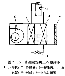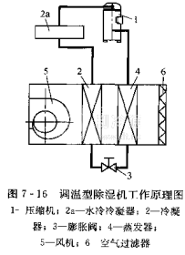 調溫型除濕機兼有究調降溫的功能,因此擁有更泛的應用領域。圖7-16為采用水冷冷凝器的調濕型除濕機工作原理圖。