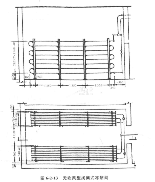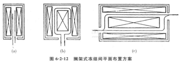 擱架式排管在凍結間的布置有三種方案(見圖6-2-12),圖中(a)只適用于小批量生產服務性小冷庫。批量生產較大的凍結間宜采用方案C,以利提高裝卸效率。