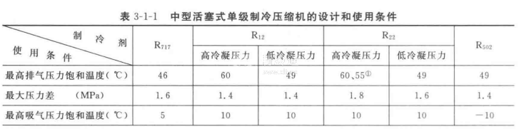 (三)選用壓縮機(jī)的工作條件不得超過制造廠規(guī)定的使用條件,新近制定的國產(chǎn)活塞式制冷壓縮機(jī)的極限工作條件見表3-1-1和表3-1-2。