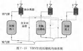 當2臺以上壓縮機并聯運行時,為防止潤滑油分配不均勻,需要設置均油系統,以防有壓縮機因缺油導致燒毀。圖7-19為VRVⅡ的壓縮機均油系統從圖中可見,每個壓縮機出口設獨立油分離器,油分離器的回油管與壓縮機的吸氣管交義連接,從而避免壓縮機因排氣量不同等因素使回油量分配不勻而發生缺油燒毀的故障。