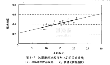 (1)冰淇淋的玻璃化貯存:冰淇淋在凝凍前是一種多元溶液,其凝凍過(guò)程如圖8~1的A一B一C。凝凍結(jié)束后,冰淇淋可能處于兩種狀態(tài):橡膠態(tài)和玻璃態(tài)。實(shí)際上,冰淇淋的T。一般為一30~一43℃,而其貯存溫度在一18℃左右,所以在貯存過(guò)程中的冰淇淋大多處于橡膠態(tài)。根據(jù)玻璃化理論,橡膠態(tài)下結(jié)品、再結(jié)品的速度較大,所以在此狀態(tài)下貯存一定時(shí)間后,冰淇淋中有大量的粗冰粒生成,質(zhì)地變得粗糙。圖8-?所示為粗冰粒度與△T(T一T)的關(guān)系曲線,可見(jiàn),△T越大,冰淇淋中粗冰粒越多。所以英國(guó)對(duì)冰祺淋的有效
