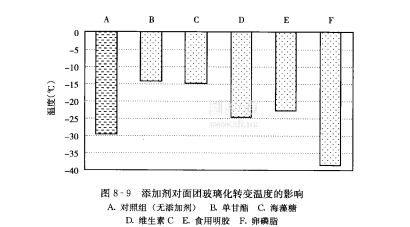 把3% 的五種添加劑分別加人含水量為40%的面團中,測量了面團的玻璃化轉變溫度,結果如圖8-9所示。可以看出,面閉中分別加入3%的添加劑后,玻璃化轉變溫度都發生了變化。海藻糖、單干酯、維生素C、明膠的添加把面團的玻璃化轉變溫度從一29.7℃分別提高到一14.8℃、一14.2℃、一24.7℃、一22.6℃:而卵磷脂的加入卻降低了面團的玻璃化轉變溫度