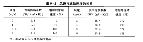 增大風速能使表面傳熱系數提高,從而提高凍結速度。風速與凍結速度的關系見表9-2。