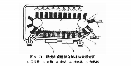 (3)水浸漬和噴淋相結合的解凍:該方法是將水噴淋和浸漬兩種解凍形式結合在一起,以提高解凍速度和解凍品的質量。圖9-21為浸漬和噴淋組合解凍裝置示意圖。魚塊由進料口進人傳送帶上的網籃,經噴淋再浸漬解凍,到出料口時,解凍已完成。
