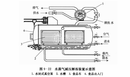 (4)水蒸氣減壓解凍:又稱為真空解凍。水在低壓低溫下沸騰,產生的水蒸氣遇到更低溫度的凍品時,就會在其表面凝結,放出凝結潛熱;該熱量被解凍品吸收,使其溫度升高而解凍。這種解凍方法適用的品種多,解凍快、無解凍過熱。