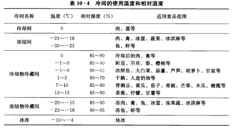 冷間的溫度和相對濕度應根據各類食品冷加工或冷藏工藝要求確定,一般按冷藏庫設計規范推薦的值選取,見表10-4。