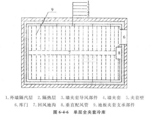 以上三種形式都屬窄夾套式,一般大型夾套庫都作成寬夾套式,其夾套的厚度達600mm左右,在夾套內裝設冷卻排管,夾套中空氣作自然對流循環,庫房與夾套只有0.5℃溫差。
