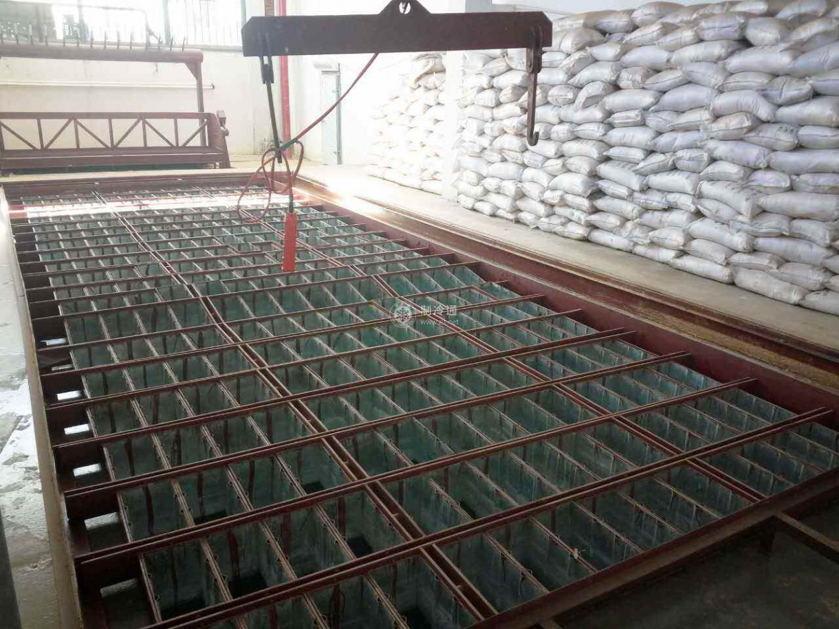 (1)制冰池的結構 制冰池體(又稱鹽水槽)是用6~8mm厚的鋼板焊制而成,其四周底部常以150~120mm厚的軟木為隔熱層,并在隔熱層外表設防潮層。池上面蓋有50~60mm厚的木蓋,有條件者可雙面焊接鋼板。為了加強剛性,避免板壁凹凸不平,在冰池的側板上常加焊適量型鋼來加固。在冰池的上部,焊有擱置蓋板和冰桶架的支架,同時又可加強池子的剛性。冰池內焊有將蒸發器和制冰池隔開的隔板,在鹽水道內還設有導流板,以便調整鹽水流速均勻。為了防止地坪凍鼓,可在池底設通風管或做地墻架空。