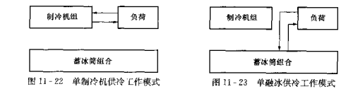 1)機組優先。流的熱乙一醇溶液,先經制冷機預冷,而后流經蓄冰裝置而被融冰冷卻至設定濕度。如圖11-24(a)所示為該種工作模式示意圖。