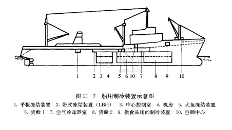 圖11-7為船用制憐裝置布局示意圖。船上條件與陸用制冷設備的工作條件大不相同,因此船用制冷裝置的設計、制造和安裝,需要具備專門的實際經驗。