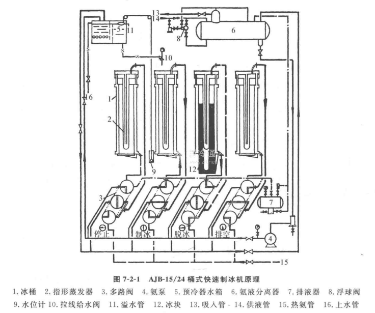 B.冰桶加水過程向冰桶加水以前,必須首先使冰桶底的彈簧活動底蓋密封。因此必須首先向冰桶中加少量的水,使冰桶壁和底蓋都被潤濕,同時將多路閥轉(zhuǎn)至“制冰“位置,使氨液進入桶壁夾層蒸發(fā)吸熱,桶壁和底蓋的潤濕水都凍結(jié),起密封桶底的作用;然后徐徐將水加入冰桶組。