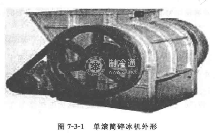 常用的單滾筒碎冰機(見圖7-3-1)是由機架、帶刺滾筒、擋板等組成,滾筒通過皮帶輪用電動機傳動,大冰塊從碎冰機上部進入,在滾筒與進冰擋板之間被裝有碎冰螺釘的回轉滾筒軋碎,由于擋板與滾筒有一定的斜度,冰塊被軋碎后,落在底部出冰滑板上。最后,沿著斜面滑出碎冰機。碎冰螺釘的伸出長度、進冰擋板與滾筒的距離可根據需要適當調整,以得到不同粉碎程度的冰。轉速為450r/min的碎冰機的碎冰能力通常為30t/h,配用電機功率為10~14kW。還有一種碎冰能力為60t/d的多滾筒碎冰機,在大、中型漁業基地中采用得較多。表7-3-1為幾種碎冰機的規格性能表。