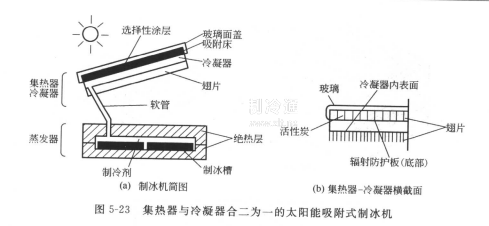 法國的Boubakri等采用活性炭-甲醇工作對的太陽能吸附式制冰機已初步商品化,其結(jié)構(gòu)特點是將吸附集熱器和冷凝器合二為一,裝置結(jié)構(gòu)如圖5-23所示19】。