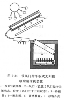 圖524所示為一種背部設(shè)有風門的、以活性炭-甲醇為工作對的太陽能吸附式制冰機,吸附/集熱器為單層玻璃蓋板的集熱器形式,冷凝器采用空氣自然對流冷卻2】。與以往的太陽能吸附式制冰機不同,該制冰機在吸附集熱器的背部