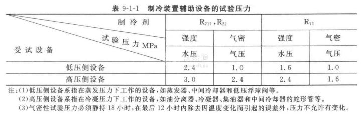 當冷凝器安裝就位后,如進廠前沒經過氣密性試驗,則需將各處閥門、接頭及法蘭盤堵住,然后按產品制造廠的規定進行氣壓試驗。如無法取得制造廠的技術文件,在一般情況下亦可取工作壓力的1.2倍進行試驗,或參照表9-1-1中所列數據。