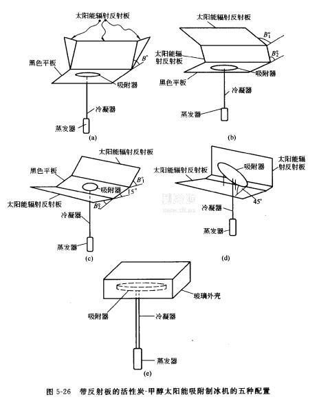 帶反射板的活性炭-甲醇太陽能吸附制冰機圖5-26所示為一種新穎的太陽能活性炭-甲醇太陽能吸附制冰機【22)。在該太陽能吸附式制冰機中,將吸附器置于一個玻璃容器中,采用太陽能輻射反射板加熱吸附器。采用該種結構,一方面可以從整個外吸附器表面對吸附工作對均勻加熱;另一方面由于吸附器、冷凝器、蒸發器等置于一個玻璃容器中,可以減少系統泄漏的可能性。在該太陽能吸附式制冰機中,每塊太陽能輻射反射板的面積為0.04m2,園柱形的吸附器的直徑為0.2m,厚度為0.05m.Khattab等測試了不同反射板傾角下吸附工作對的最高解吸溫度。此外,Khattab等還提出了4種方法以提高吸附器的熱性能:(1)在吸附器的外表面裹黑色的金屬絲網:(2)在吸附器的外表面裹黑色的金屬薄板;(3)在吸附器顆粒活性炭中添加黑色的金屬碎片:(4)將顆粒活性炭添加黑色的金屬碎片固化。