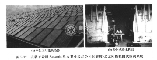 此外,在希臘Sarantis S.A地區某化妝品公司也安裝了一套制冷功率為350kW的太陽能吸附式空調系統,用于22000m2(130000m3)的房間空調,如圖5-37所示。該太陽能吸附式空調系統采用2700m2的平板集熱器產生70~75℃