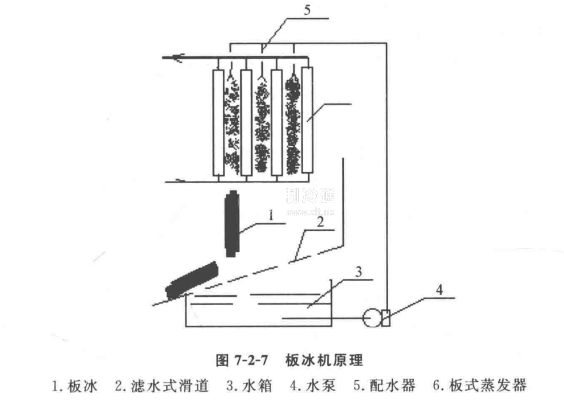 板冰機主要結(jié)構(gòu)是數(shù)塊空心鋁制制冰板,制冰水從板的一面或兩面自上往下澆淋,制冷劑在板內(nèi)蒸發(fā)吸熱,使板表面的水凍結(jié)成冰,未結(jié)冰的水往下流至水槽匯入水箱,水箱內(nèi)的水由水泵送到制冰板上部循環(huán)噴淋使用。當板冰達到一定厚度,停止淋水和供液,用熱制冷劑蒸氣或電加熱器加熱的鹽水(乙二醇溶液)脫冰,并靠自重下落成碎冰進入貯冰間貯存。