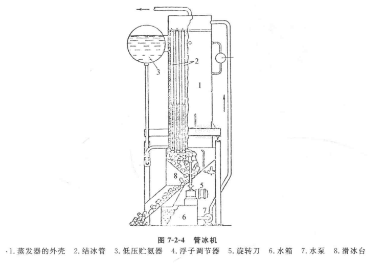 管冰機(jī)的結(jié)構(gòu)如圖7-2-4所示,主要由蒸發(fā)器、低壓貯液器、水泵、水箱、旋轉(zhuǎn)刀片等組成。蒸發(fā)器為直立殼管式,其結(jié)構(gòu)為3~4m高的鋼制直立圓筒,兩端有封板,之間焊有多根通徑為50m的無縫鋼管(即制冰管)。制冷劑在制冰管外蒸發(fā)制冷,制冰水從上部經(jīng)分配器沿管子內(nèi)壁呈薄膜狀往下流動而被冷卻。開始時為冰殼,并逐漸加厚形成冰管,全部凍好的冰柱大約在40min內(nèi)形成,由于制冰之水在不斷循環(huán),使其中的空氣被排除,因而制出的冰為透明而密實。