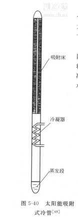 太陽能冷管圖5-40所示為一特殊設計的太陽能吸附式冷管,它利用固體吸附制冷技術在一根管子內實現吸附制冷的循環過程,周期性輸出冷量。