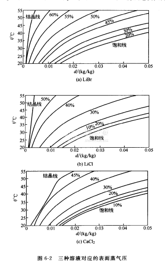 (1)除濕溶液的蒸氣壓是濃度和溫度的函數。從圖6-2可以看出,在相同的溫度和質量濃度下IiCl溶液比LiBr溶液和CaCl2溶液的蒸氣壓低,所以在與所接觸的濕空氣達到平衡時,濕空氣具有更低的相對濕度;但是IB溶液和CaCla溶液的再生比LCI溶液容易:但在實際運用中,由于IiBr的溶解度很大,所以采用較濃的溶液以取得比LC】溶液更低的蒸氣壓。