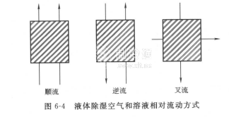 常見的液體除濕器中空氣和溶液相對流動方式可分為順流、逆流和叉流,如圖6-4所示。RAHAMAH,M.M.ELASAYED等人【1)對順流的布置運用控制體積法進行了相關的理論分析,發(fā)現減少空氣流量和增大填料的高度可以從延長氣液接觸時間和擴大接觸面積上改進除濕度效果。Rahmah等12】在順流布置的裝置中對不同影響參數對除濕的影響進行了實驗研究。逆流布置是液體除濕中最廣泛運用的一種方式,Factor,H.M,and Grossman,G13】在逆流布置的填料塔中進行了相關的實驗研究。對于叉流布置的除濕裝置目前研究的不多,Y.J.D等給出了叉流布置的以蜂窩紙為填料的除濕裝置進行了相關的理論分析。相關的分析表明,逆流和叉流的布置在傳質方面要優(yōu)于順流布置。關于叉流和逆流的比較研究,由于實驗條件和各種影響因素不同,還沒有統(tǒng)一的結論。但是,在設備安裝,風道布置,以及提高裝置的緊湊性方面,叉流布置要優(yōu)于逆流布置。
