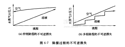 多級除濕傳統的溶液除濕空調系統除濕器中溶液的流量很大,濃溶液和稀溶液的濃度差為2%左右。盡管在除濕過程中采取一些冷卻措施來減弱由于溶液溫升導致其吸濕能力下降的趨勢,但是傳質過程中水蒸氣分壓差造成的不可逆損失仍然很大,如圖6-7(a)所示。上述過程導致的直接后果是再生溫度高,再生器的效率低。解決上述問題的方法是采用分級除濕,即在除濕的過程中鹽溶液的濃度隨著濕空氣濕度的變化而變化,同時每一級都采取相應的玲卻措施。這樣,如圖6-7(b)所示,傳熱溫差、傳質的濃度差會大大減小,從而減小了除濕過程的不可逆損失,充分利用了溶液的吸濕能力,即在吸收同樣多水分的情況下,分級的方法可使得溶液的濃度差達到10%左右。這樣送回再生器的溶液的濃度降低了,更容易根據質量平衡關系采用分級除濕,除濕器中溶液的流量會因為濃度差的增大而變小,而小流量會減小氣液接觸面積。因此,為了強化換熱,要保證除濕器每一級內的溶液流量很大,而為了充分利用溶液的吸濕能力,提高溶液進出口濃度差,級與級之間的流量要很小。這樣既能保證換熱有充分的接觸面積,又使得溶液進出口可以實現高的濃度差。