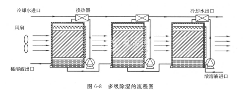 多級除濕的流程圖如圖68所示,處理風的流向和濃溶液的流向相反,較濃的溶液處理濕度比較小的空氣,較稀的溶液處理濕度比較大的空氣,目的是保持一定溶液和氣體的蒸氣壓差。每個級上都設有板式換熱器,冷水通過冷卻除濕劑,誠少除濕過程中蒸氣凝結熱對溶液蒸氣壓的不良影響。